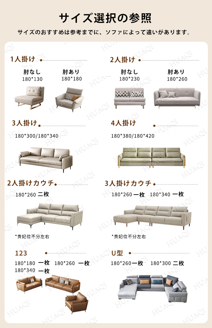 サイズ: 1人掛け180x130cm 1人掛け180x180cm 2人掛け180x230cm 3人掛け180x260cm 3人掛け180x300cm 4人掛け180x340cm 4人掛け180x380cm 4人掛け180x420cm