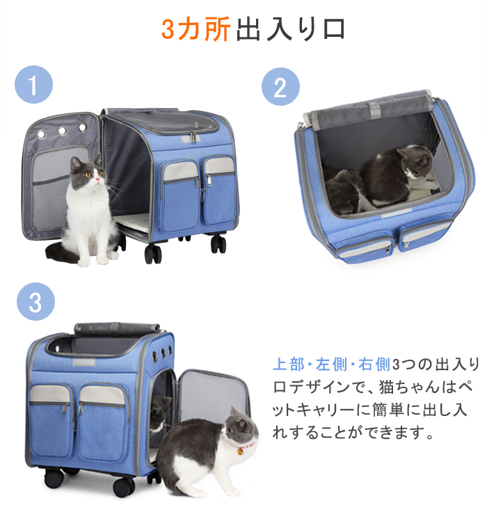 上部・左側・右側3つの出入り口デザインで、猫ちゃんはペットキャリーに簡単に出し入れすること ができます。