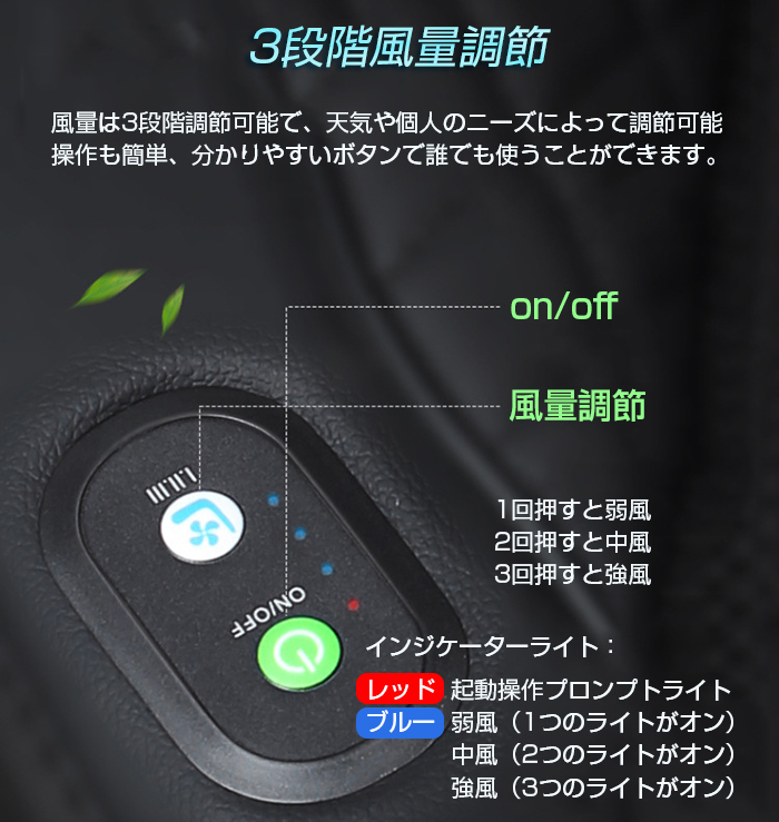 風量は3段階調節可能で、天気や個人のニーズによって調節可能操作も簡単、分かりやすいボタンで誰で も使うことができます。
