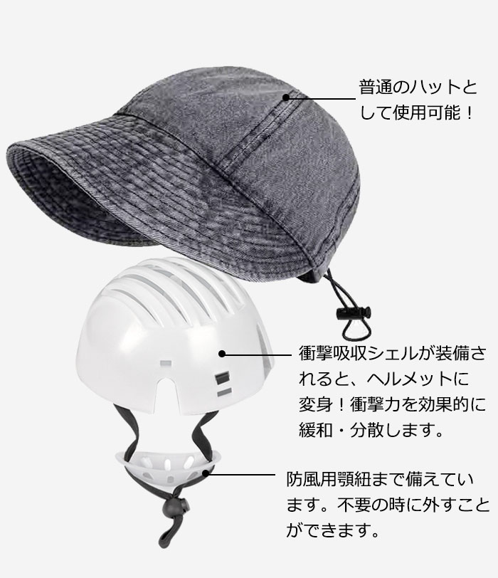 内部に衝撃吸収インナープロテクターが装備され、衝撃力を効果的に緩和・分散します。 外すと、普通のバケットハットとして使用可能!