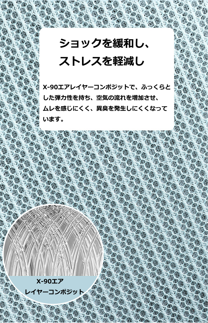 ショックを緩和し、ストレスを解消します。 旅の疲労を軽減します。 X-90エアレイヤーコンポジットで、ふっくらとした弾力性を持ち、空気の流れを増加させ、ムレを感じず、異臭を発生しにくくなっています。