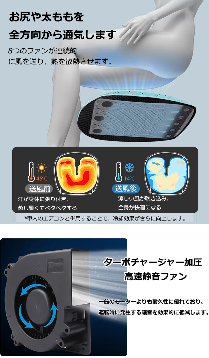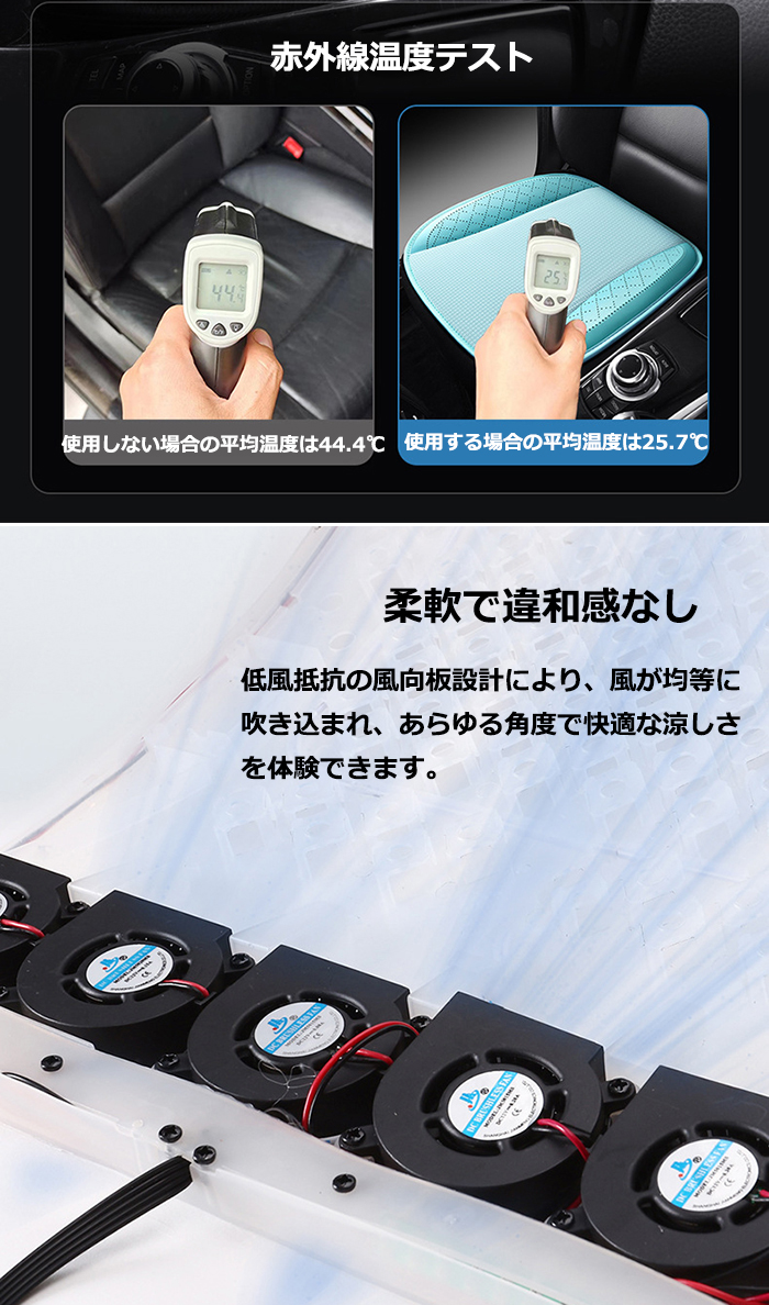 柔軟で違和感がありません 低風抵抗の風向板設計により、風が均等に吹き込まれ、あらゆる角度で快適な涼しさを体験できます。 ファンの位置を適切に配置し、お尻や太ももを全方向から通気します 8つのファンが連続的に風を送り、熱を散熱させます。