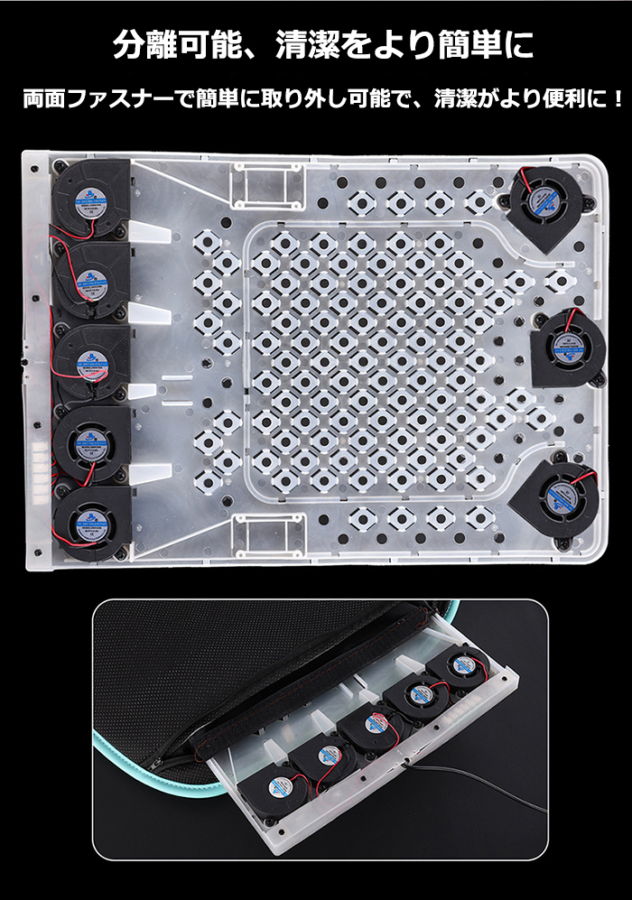 ターボチャージャー加圧、高速静音ファンです。一般のモーターよりも耐久性に優れており、運転時に発生する騒音を効果的に低減します。 両面ファスナーで簡単に取り外し可能で、清潔がより便利に!