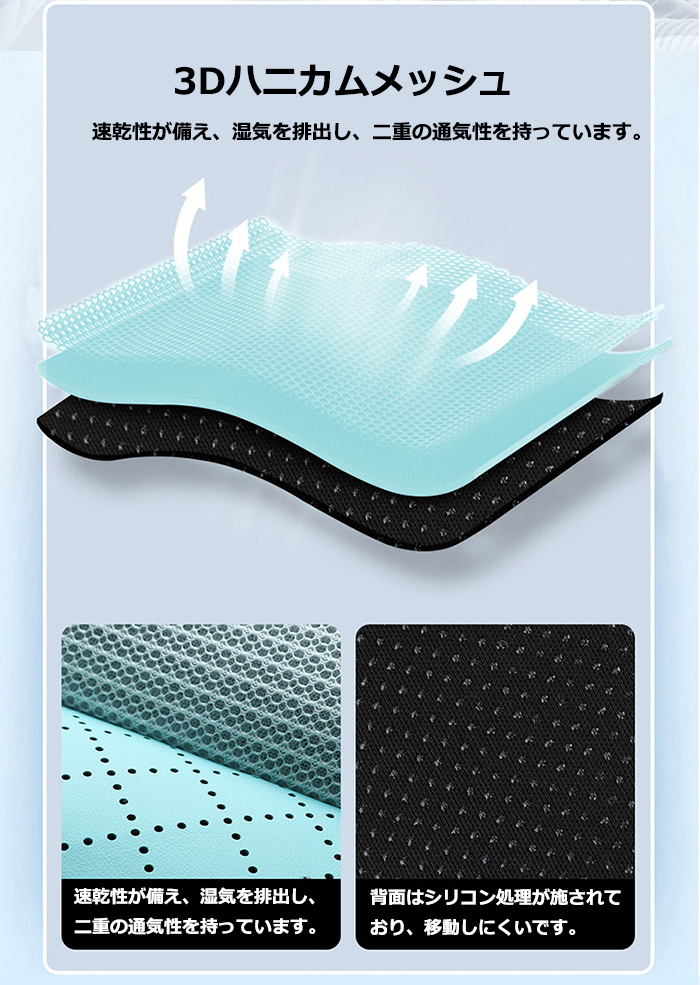 網状のデザインで、蒸れにくく、汗をかきにくいです。通気穴 がたくさんあり、涼しく通気性が抜群、急速に冷却されます。 速乾性が備え、湿気を排出し、二重の通気性を持っています。 3Dハニカムメッシュ生地で通気性が良く、柔らかい質感と柔軟性があります。