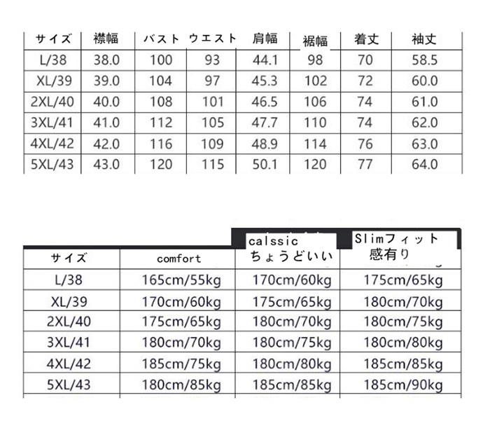 サイズ: 38/L(日本S相当) 39/XL日本M相当) 40/2XL日本L相当) 41/3XL日本XL相当) 42/4XL日本2XL相当) 43/5XL(日本3XL相当)