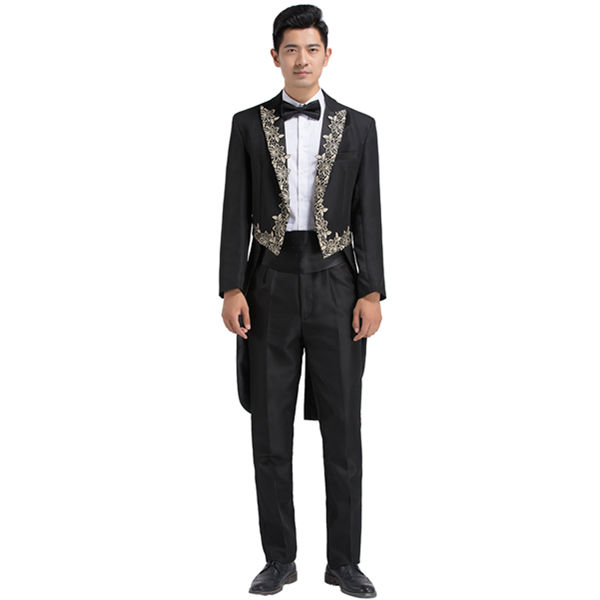 ブラックメンズフォーマルスーツ 燕尾服結婚式 パーティ 司会スーツ ズボン 蝶タイ カマーベルトの4点セットお呼ばれ披露宴二次会