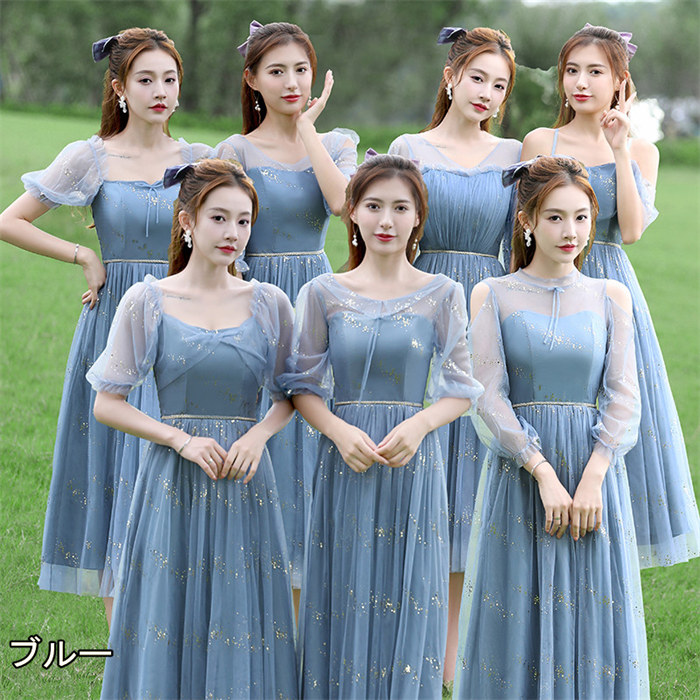 4色展開7デザインブライズメイドドレスパーティードレスミディアムドレス ミモレ丈 二次会 フォーマル 発表会 ステージ ウエディング 卒業イベントブルー グリーン ピンク グレーお買いドレス特価ドレス