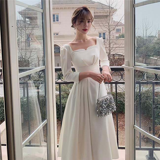 ホワイト ウェディングドレスライン長袖ミディアムドレス ウェディングドレス レース 素地 ファスナータイプ~3 お花嫁結婚式旅行撮影演出レディースウェディングドレス