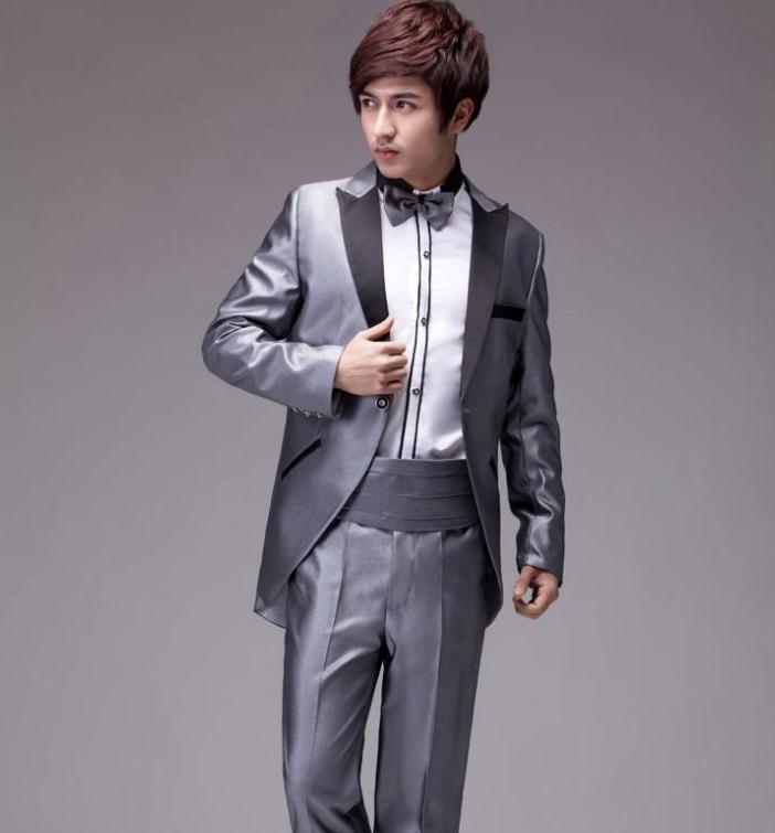 シルバーメンズフォーマルスーツ 燕尾服結婚式 パーティ 司会スーツ ズボン 蝶タイ カマーベルトの4点セットお呼ばれ披露宴二次会