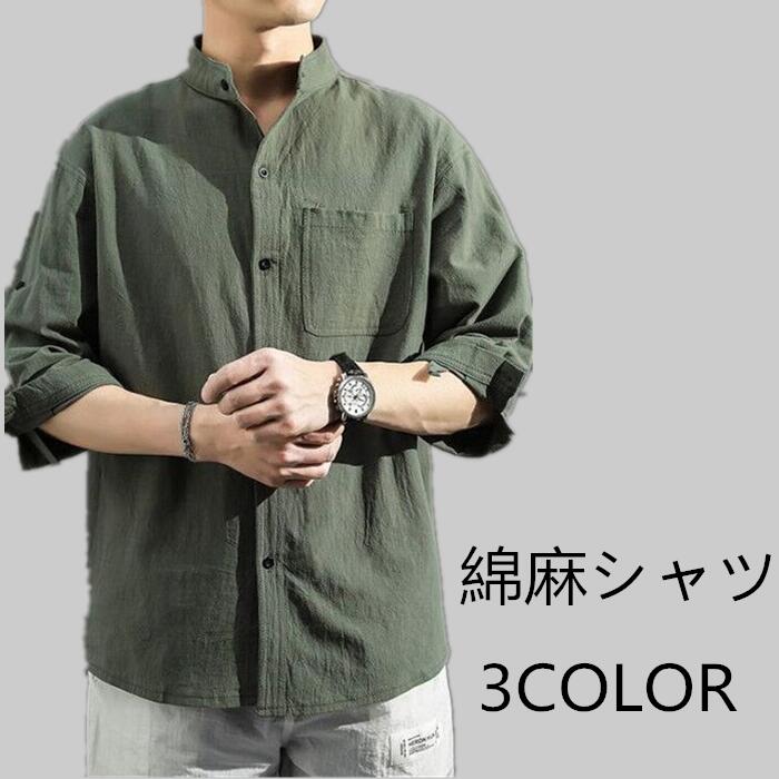 リネン シャツ 七分袖 メンズシャツ 綿麻シャツ 父の日 立ち襟 トップス 無地 薄手 夏 カジュアル シンプル プレゼント ギフト