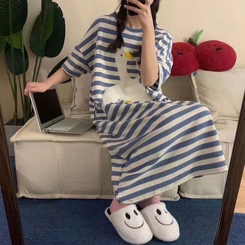 レディース Tシャツワンピース ルームウエア パジャマ 夏 英文字 ゆったり 半袖 ボーダー柄 薄手 可愛い ブラック レッド M L XL 2XL SLPA005