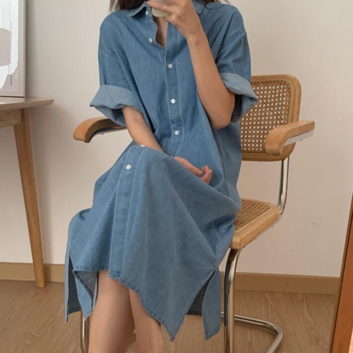 ワンピースシャツワンピース ロングシャツオーバーサイズ羽織りデニム風レディース ロング 半袖大きいサイズスリットゆったりカジュアル夏