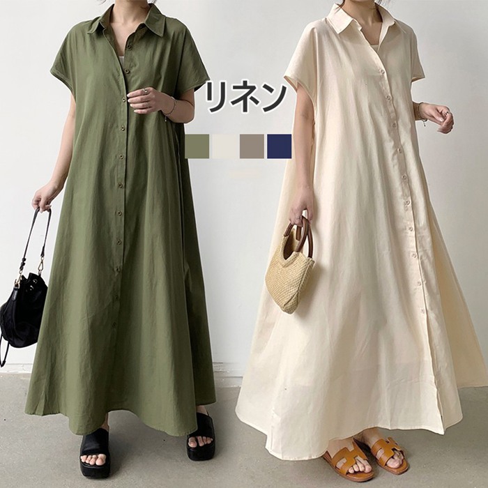 シャツワンピース 夏 レディース 半袖 リネン ワンピース ロング丈 Vネック ゆったり シンプルワンピース 大人 Aライン 体型カバー