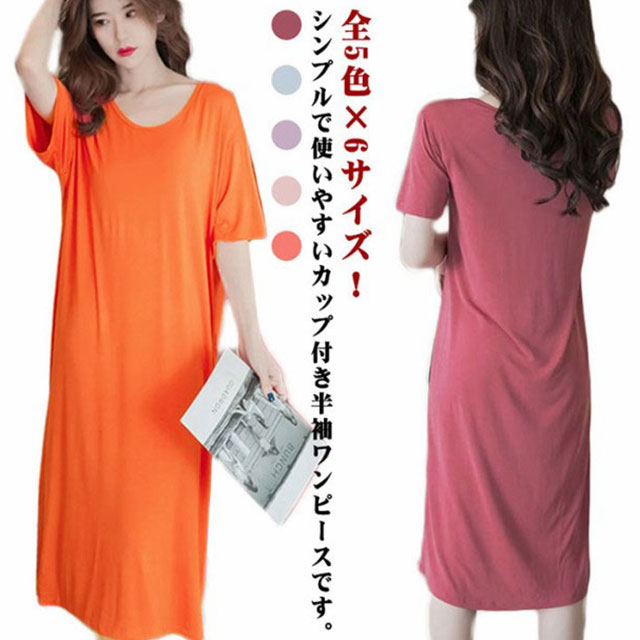 ルームウェア ワンピース カップ付き インナー ワンピース 半袖 マキシ丈 シンプル ネック パジャマ プルオーバー
