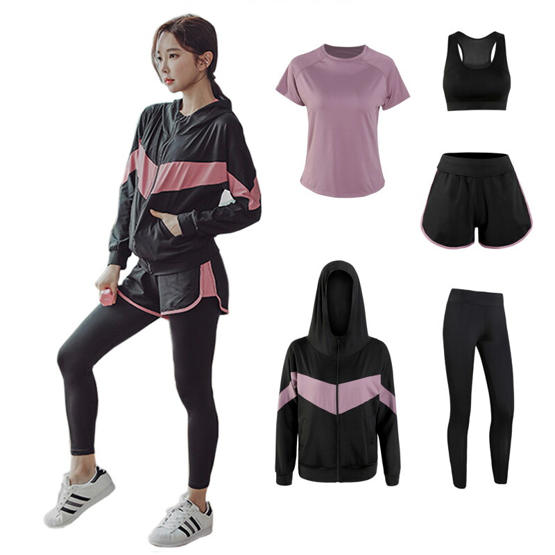 コンプレッションウェア ユガウェア ランニングウェア トレーニングウェア 上下 長袖 半袖 おしゃれ レディーススポーツウェア 5点セット 瑜伽 パーカー トレーニング ランニング ショートパンツ レ