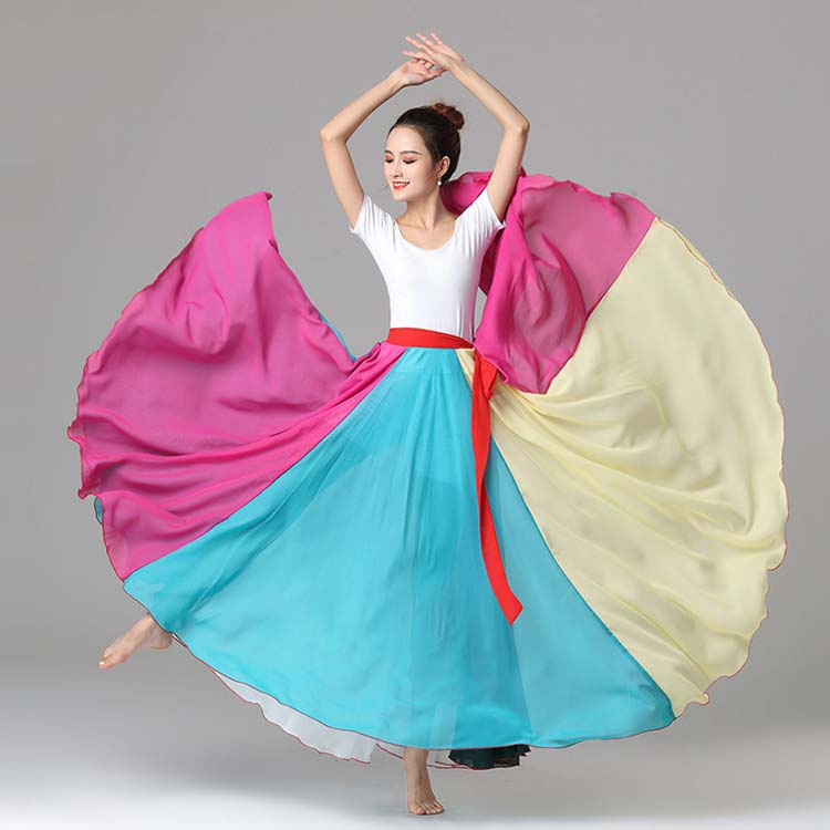 マルチカラー 巻きスカート モダンドレス 民族ダンス 練習着 配色 レッスンウェア ロング 大きい裾 95 フレア 社交ダンス フラメンコ バレエ 90 古典ダンス 80 スカート