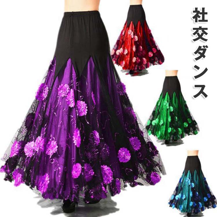 ワルツ 衣装 レッスンウェア スカート 練習着 ロングスカート フワラー付き ダンス ブルー 緑 ボトムス モダンドレス 赤 舞台ステージ衣装 広がるダンス 花 スパンコール 紫 スカート