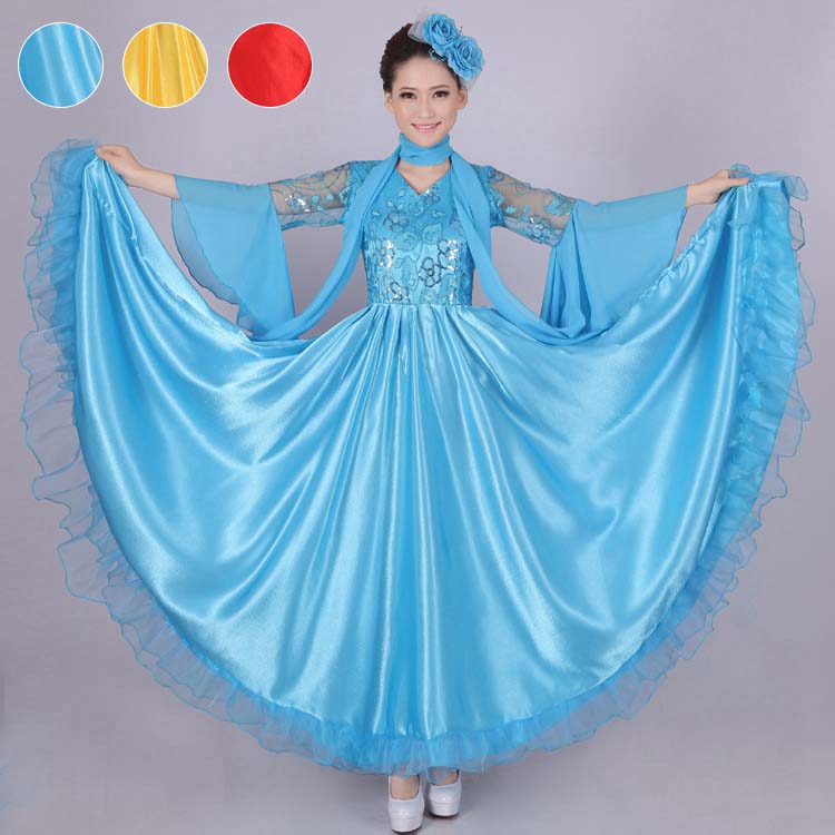 民族ダンス スパンコール 古典ダンス衣装 シースルー長袖 裾フリル フリル袖 きらきら舞台ステージ ワンピース ワルツ 社交ダンス衣装 衣装 ダンス 裾ワタリ360°540°720°選べる