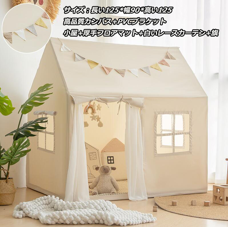 キッズテント 子供部屋 プレゼント 子供テント キッズ プレイテント 組み立て簡単 室内室外 小屋 厚手フロアマット カーテン 旗 ブラケット 窓つき 通気性 扉つき