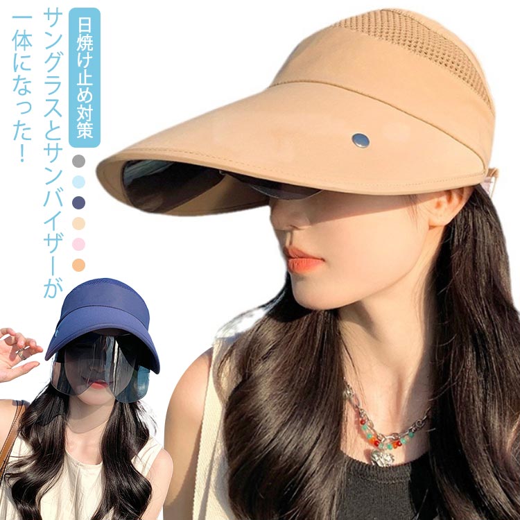 サンバイザー レディース サングラス付き 全顔覆う つば広帽子 紫外線対策 自転車 カット フェイスカバー 花粉症対策 日焼け軽減 ゴルフ ワイドバイザー