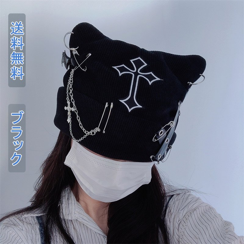 帽子 ニット帽 レディース おしゃれ ワッチ ビーニー かわいい 猫耳 ネコミミハット 原宿系 安ピン チェーン クロスチャーム ベルト 派手カワ ファッション カジュアル パンク ロック ギャル 個