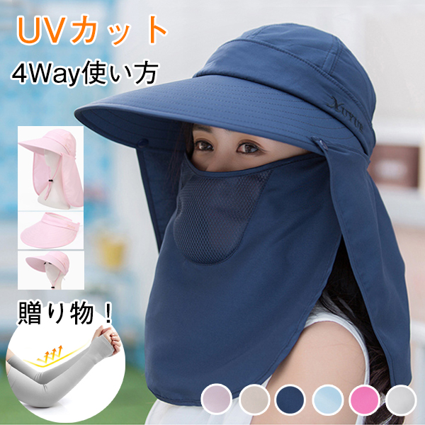 つば広帽子 ラッシュガード 帽子 日よけ サンバイザー ガーデニング 4使い方 カット フェイスカバー付き 日焼け防止 取外し可 アームカバーおまけ 紫外線対策用ハット 農作業 紫外線対策