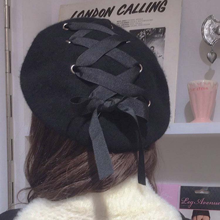 ベレー帽 ブラック レディース メンズ 男女兼用 ユニセックス ゴスロリ パンク ロック 帽子 フリル リボン 靴ひもデザイン お姫様 ゴシック ゆったり 運動会 旅行 ギフト