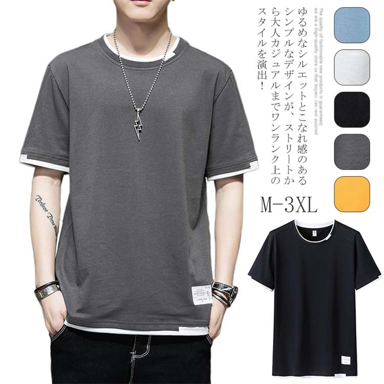 Tシャツ メンズ 半袖 夏服 レイヤード風 重ね着風 ステッチカラー カットソー クルーネック 涼しい 夏 ファッション 3color トップス