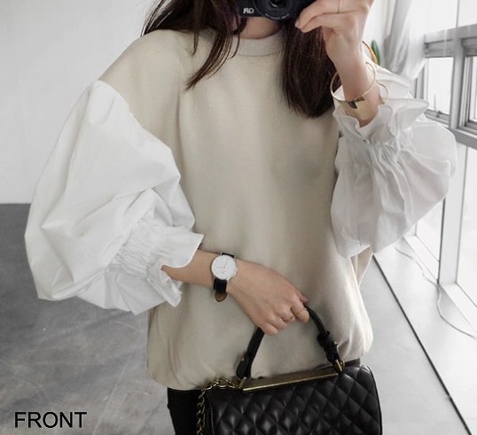 レディーストップスセーターニットラウンドネックパフスリーブ切替無地長袖大きいサイズゆったり大人カジュアルフェミニン普段着おしゃれデート