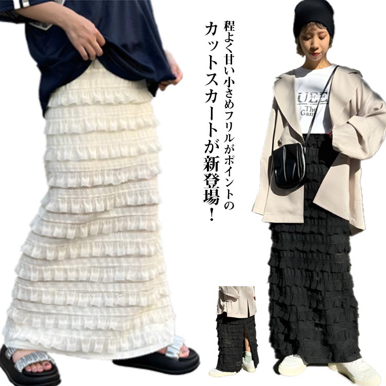 スカート ロングスカート フリル ウエストゴム 細見え 体系カバー 伸びる フリルスカート 無地 おしゃれ 秋服 ボトムス