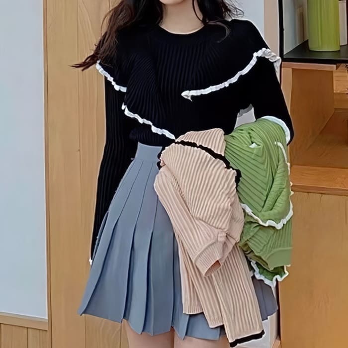 中学生 高校生 レディース ファッション 韓国 リブ ニット フリルデザイン 秋春冬 長袖 トップス 通学 通勤 カジュアル ナチュラル ガーリー 可愛い きれいめ 10代 20代 おしゃれ 1780