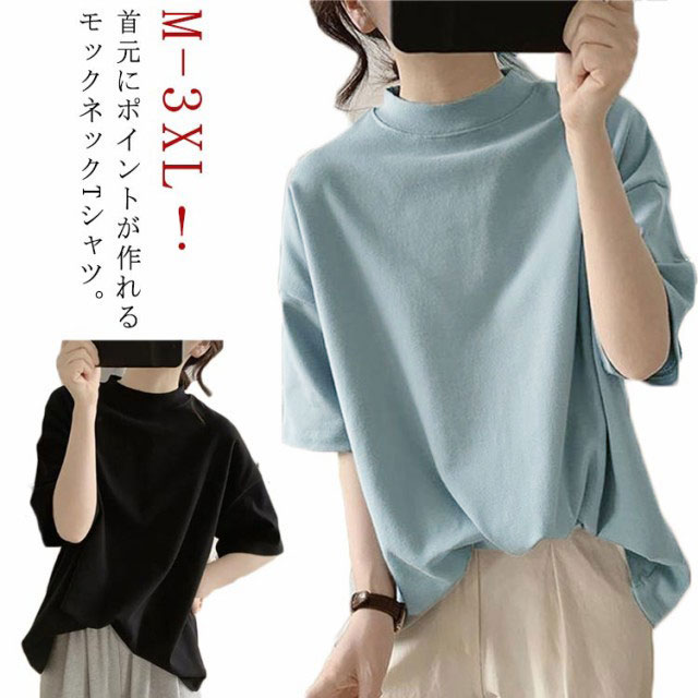 レディース サマー 春夏 無地Tシャツ 5分袖 半袖 半袖 シンプル ハイネック ゆったり tシャツ Tシャツ