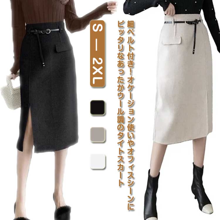 スカート レディース ボトムス 冬 通勤 ウール調 台形スカート 暖かい フロントスリット ミドル丈 オフィス タイトスカート