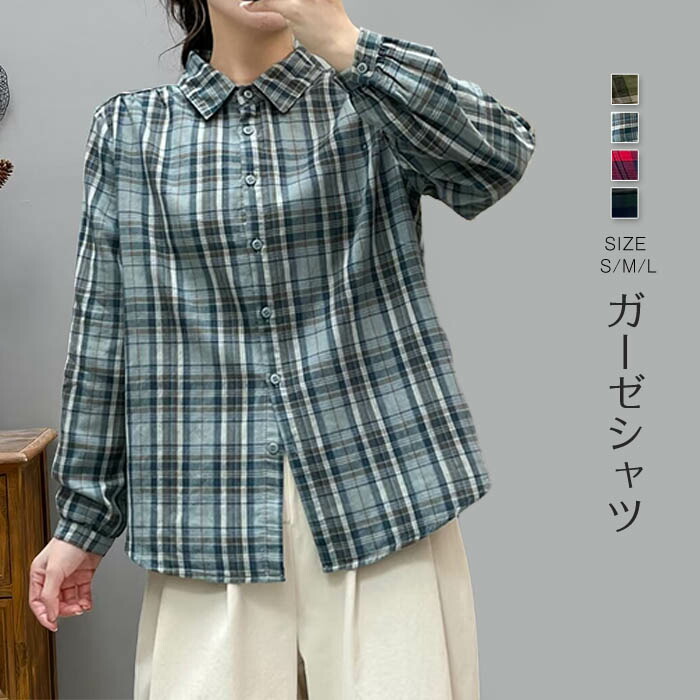 ガーゼシャツ コットン レディース 綿100% 長袖 ダブルガーゼ 春秋 配色 チェック トップス ダブルガーゼシャツ ガーゼシャツ レディースシャツ レディーストップス