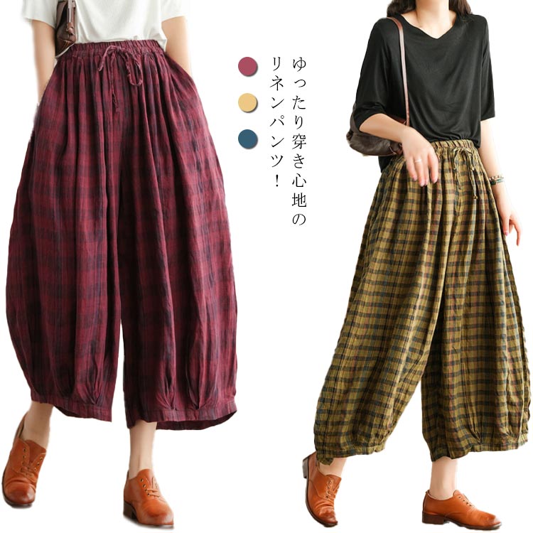 リネンパンツ リネン100% ワイドパンツ レディース サルエルパンツ 9分丈 バルーンパンツ チェック柄 ゆったり 大人カジュアル ボトムス 体型カバー ウエストゴム