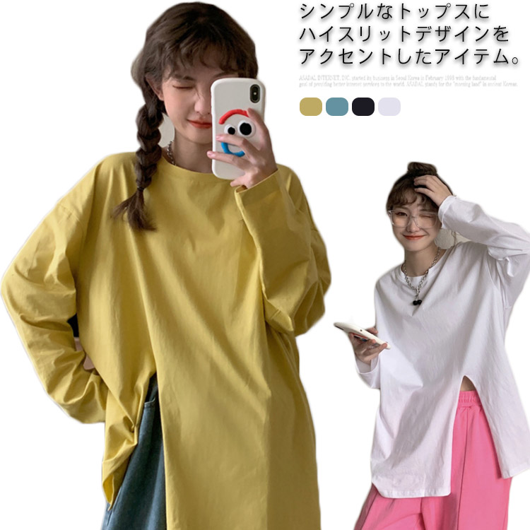 レディース 長袖 トップス Tシャツ シンプル 春 夏 秋 冬 薄手 ハイスリット 大きいサイズ 可 ゆったり インナー 韓国ファッション 長袖Tシャツ 楽ちん 着瘦せ 体型カバー