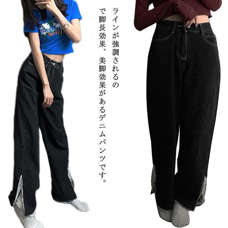 かわいいレーススリット、-4までのワイドデニムパンツです レディースファッション ボトムス パンツ