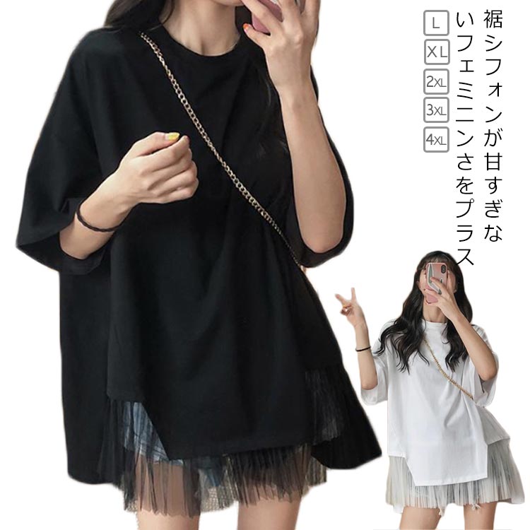 シフォン ブラウス 切り替えTシャツ レディース おしゃれ ロング丈 プレゼント ゆったり 春夏 薄手 ティーシャツ 半袖 シンプル 無地 体型カバー ビッグシルエット ホワイト ブラック 大きいサイ