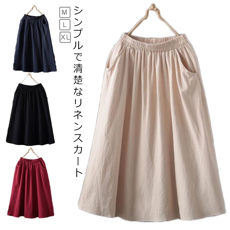 M L XL 綿麻スカート 体型カバー ポケット付き 綿麻スカートレディースファッション ボトムス スカート
