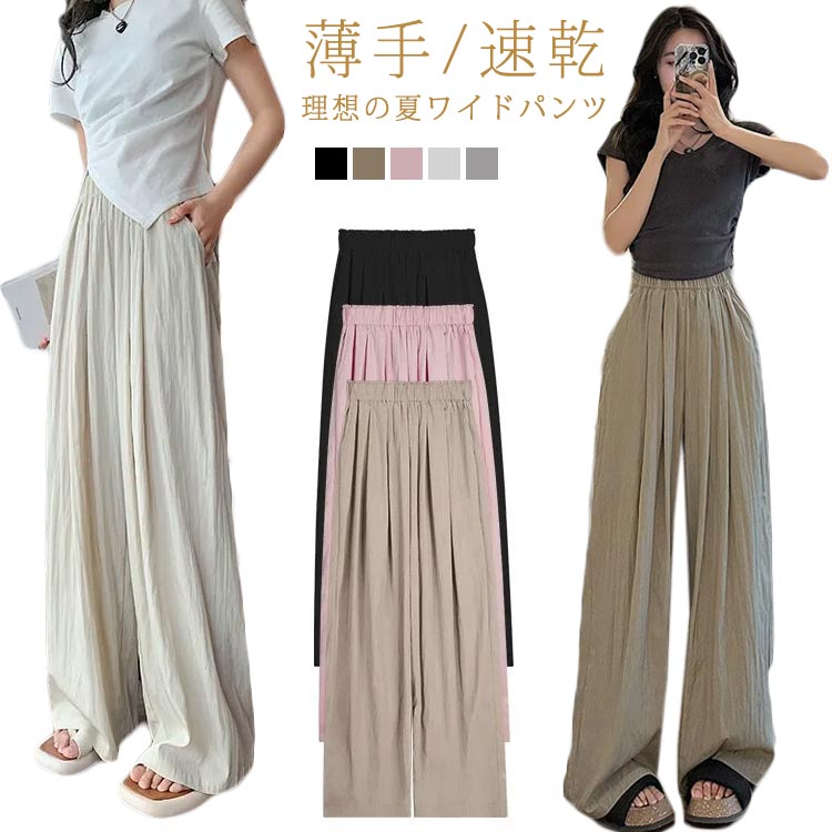 ウエストゴム 美脚 無地 ポケット付き 薄手ワイドパンツレディースファッション ボトムス パンツ