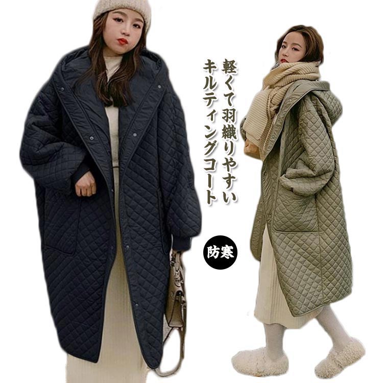 S M L カジュアル キルティング中綿コート フード付き ロング丈レディースファッション コート ジャケット