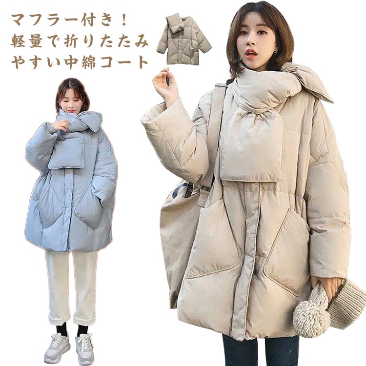 軽量 秋冬 あったか 無地 体型カバー マフラー付き中綿コートレディースファッション コート ジャケット