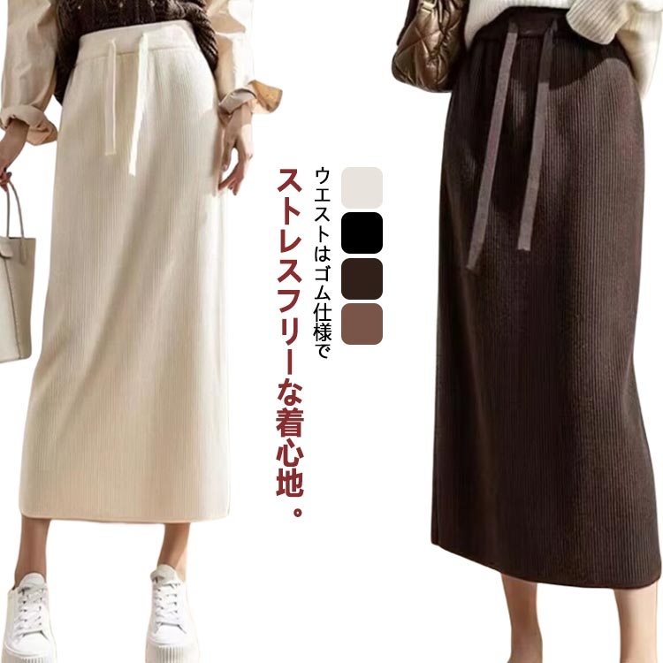 ウエストゴム ロングスカート 着瘦せ 美脚 着瘦せ リブニットレディースファッション ボトムス スカート