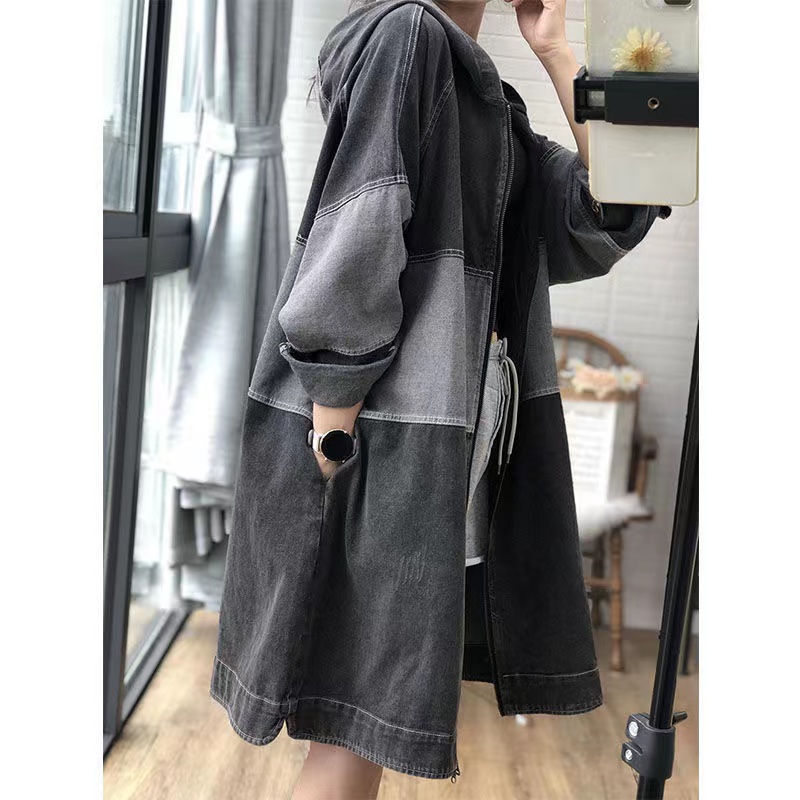 レディース デニムコート ロングコート 春秋 デニム 長袖 ゆったり 薄手 アウター トップス フード付き グレー ブルー 2 006