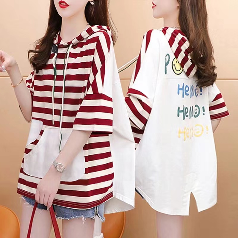 tシャツ パーカー フード付き レディース ボーダー柄 半袖tシャツ ゆったりレディースファッション トップス Tシャツ カットソー