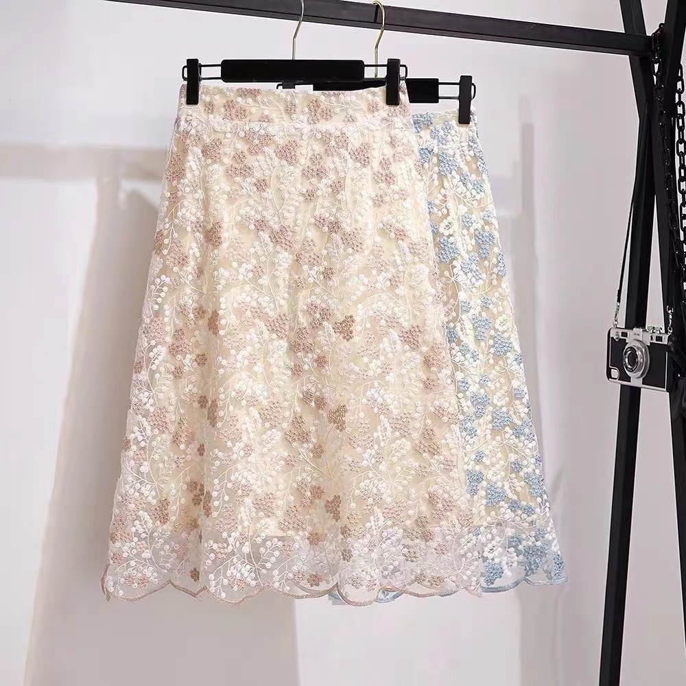 スカート レディース 春夏秋 刺繡 チュール付き ハイウエスト ロングスカート長さ75cm LKCA005