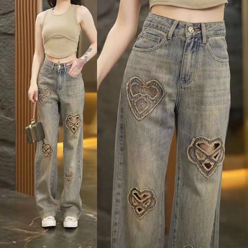 デニムパンツ レディース 美脚 ハート柄 刺繍 ダメージ加工 ワイドパンツレディースファッション ボトムス パンツ
