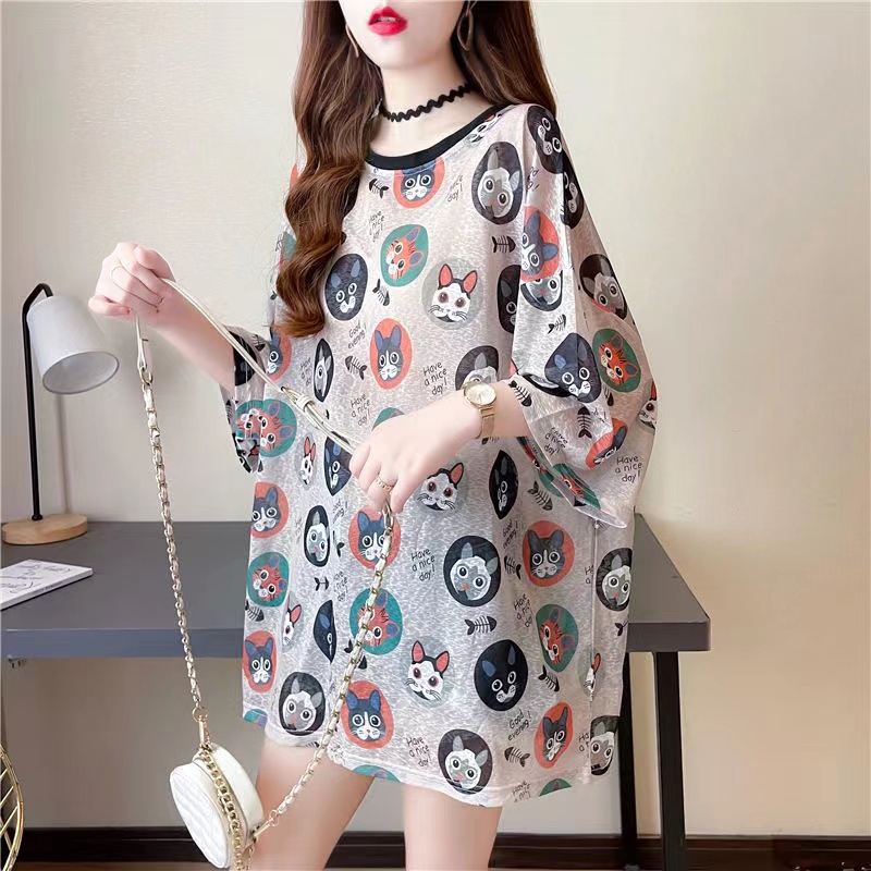 レディース シャツ 夏 ゆったり トップス チュニックシャツ シースルー トップス 透け感 レディースティーシャツ レディーストップス 可愛い クール 総柄 カジュアル 丸首 薄手 猫柄 ねこ柄