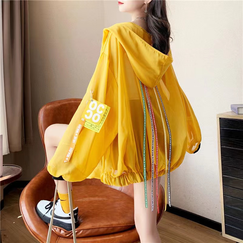 日焼け止め レディース 夏 ゆったり 透け感 トップス カジュアル 長袖 英文字 薄手 可愛い アウター フード付き ホワイト イエロー S M L XL 2XL SLCA015