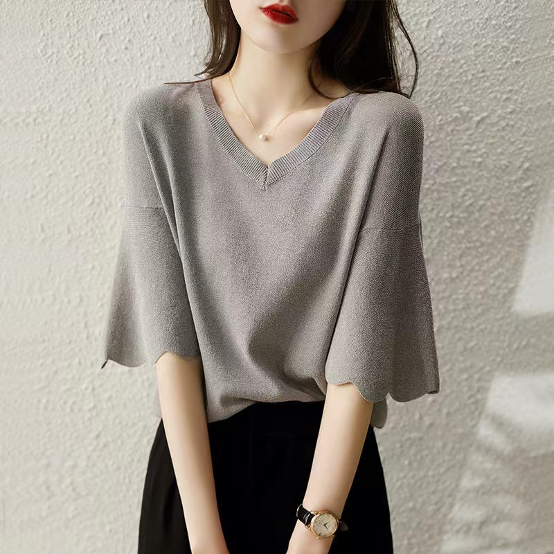 レディース トップス 夏 ゆったり ニット サマーニット 夏ニット 薄手ニット 通勤 Vネック クール オフィスカジュアル スカラップ ワイドスリーブ vネックニット 薄手 無地 大人かわいい 大人可